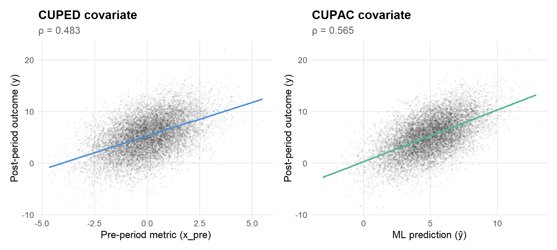 Out-of-sample predictive correlation (CUPAC): does \(\hat{Y}\) predict \(Y\) well? What’s the correlation? Is it materially better than the raw pre-metric?