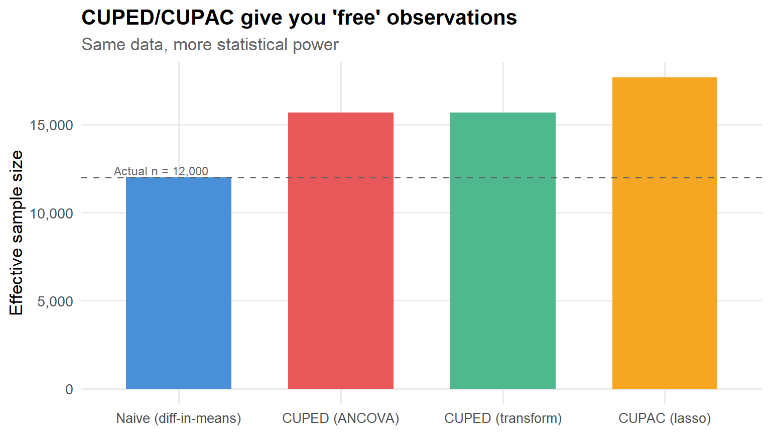 results |>mutate(effective_n = n / se_ratio^2,method =fct_reorder(method, effective_n) ) |>ggplot(aes(x = method, y = effective_n, fill = method)) +geom_col(width =0.65, show.legend =FALSE) +geom_hline(yintercept = n, linetype ="dashed", color ="grey40") +annotate("text", x =0.6, y = n +400, label =paste0("Actual n = ", scales::comma(n)),hjust =0, size =3.2, color ="grey40") +scale_fill_manual(values = pal) +scale_y_continuous(labels = scales::comma_format()) +labs(x =NULL,y ="Effective sample size",title ="CUPED/CUPAC give you 'free' observations",subtitle ="Same data, more statistical power" ) +theme(axis.text.x =element_text(size =10))