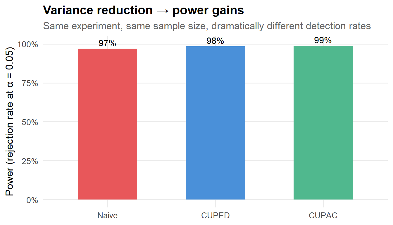 If this feels too good to be true, it might help to think about the extreme case: if \(X_i\) perfectly predicted \(Y_i\) in the absence of treatment, then \(Y_i^{\text{cuped}}\) would just be the treatment effect plus a tiny bit of noise. You’d detect everything instantly. In practice, \(X_i\) is an imperfect predictor, so the variance reduction is partial—but often substantial.