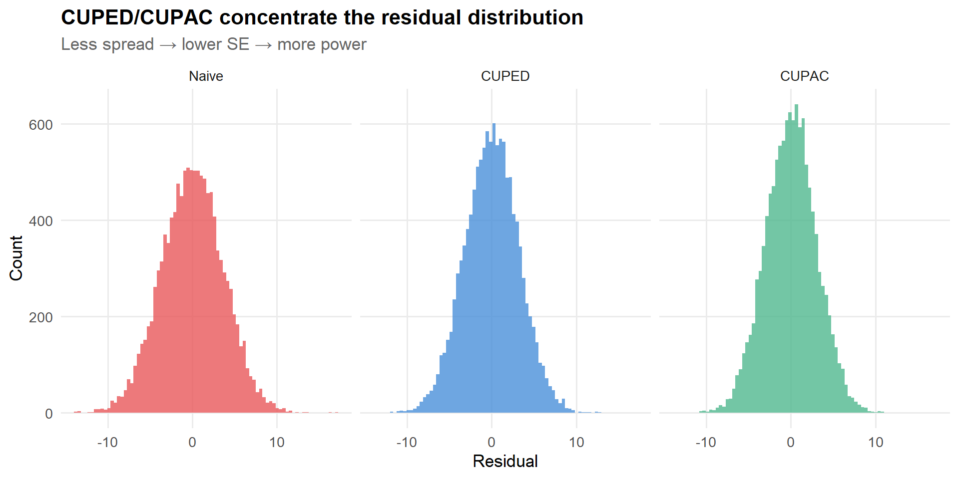 The visual tells the same story as the numbers: the residuals get progressively tighter as we use more informative covariates. Each step from left to right is like turning up the signal-to-noise ratio.