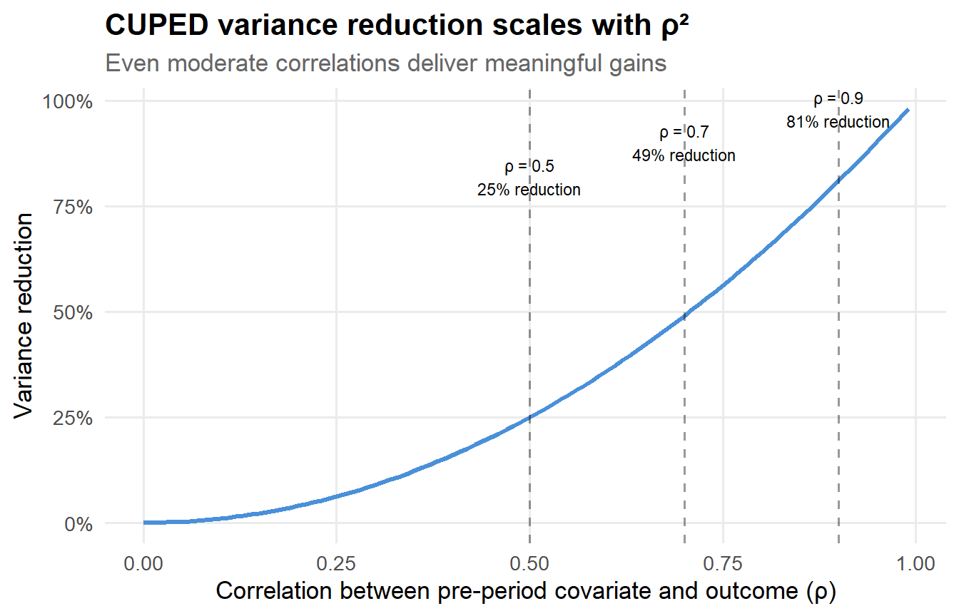 tibble(rho =seq(0, 0.99, by =0.01)) |>mutate(var_reduction = rho^2,sample_size_multiplier =1/ (1- rho^2) ) |>ggplot(aes(x = rho, y = var_reduction)) +geom_line(linewidth =1.2, color = pal[1]) +geom_vline(xintercept =c(0.5, 0.7, 0.9), linetype ="dashed", alpha =0.4) +annotate("text", x =0.5, y =0.82, label ="ρ = 0.5\n25% reduction",size =3, hjust =0.5) +annotate("text", x =0.7, y =0.90, label ="ρ = 0.7\n49% reduction",size =3, hjust =0.5) +annotate("text", x =0.9, y =0.98, label ="ρ = 0.9\n81% reduction",size =3, hjust =0.5) +scale_y_continuous(labels = scales::percent_format()) +labs(x ="Correlation between pre-period covariate and outcome (ρ)",y ="Variance reduction",title ="CUPED variance reduction scales with ρ²",subtitle ="Even moderate correlations deliver meaningful gains" )